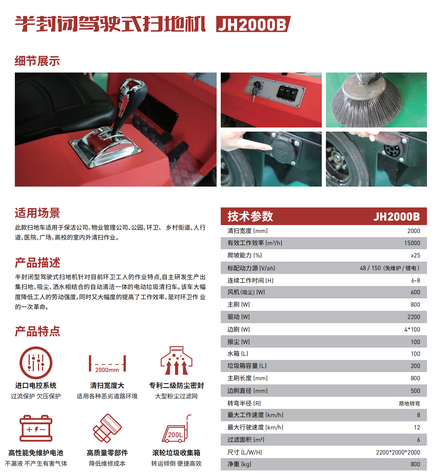 此款扫地车适用于保洁公司、物业管理公司、公园、环卫、乡村街道、人行道、医院、广场、高校的室内外清扫作业。