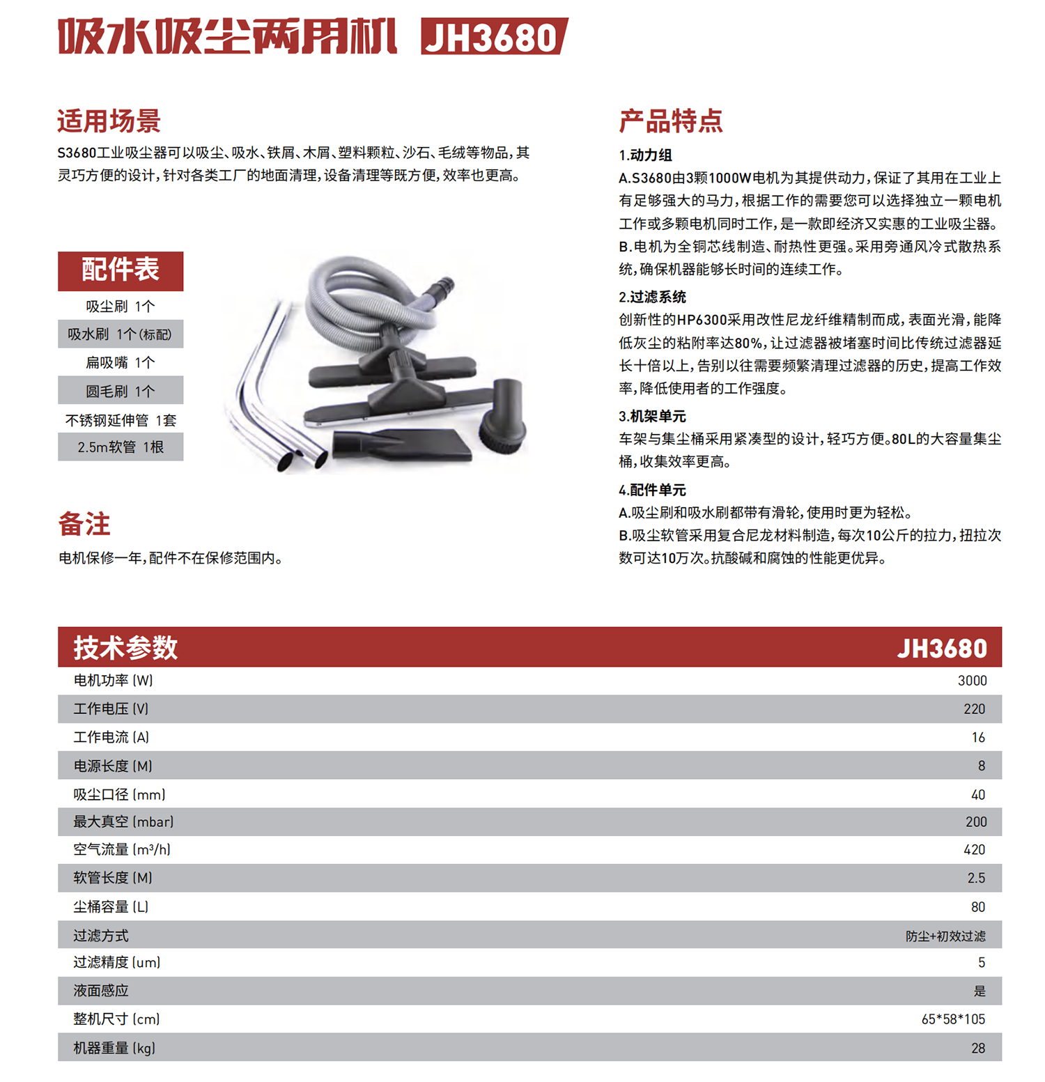 S3680工业吸尘器可以吸尘、吸水、铁屑、木屑、塑料颗粒、沙石、毛绒等物品,其灵巧方便的设计,针对各类工厂的地面清理,设备清理等既方便,效率也更高。