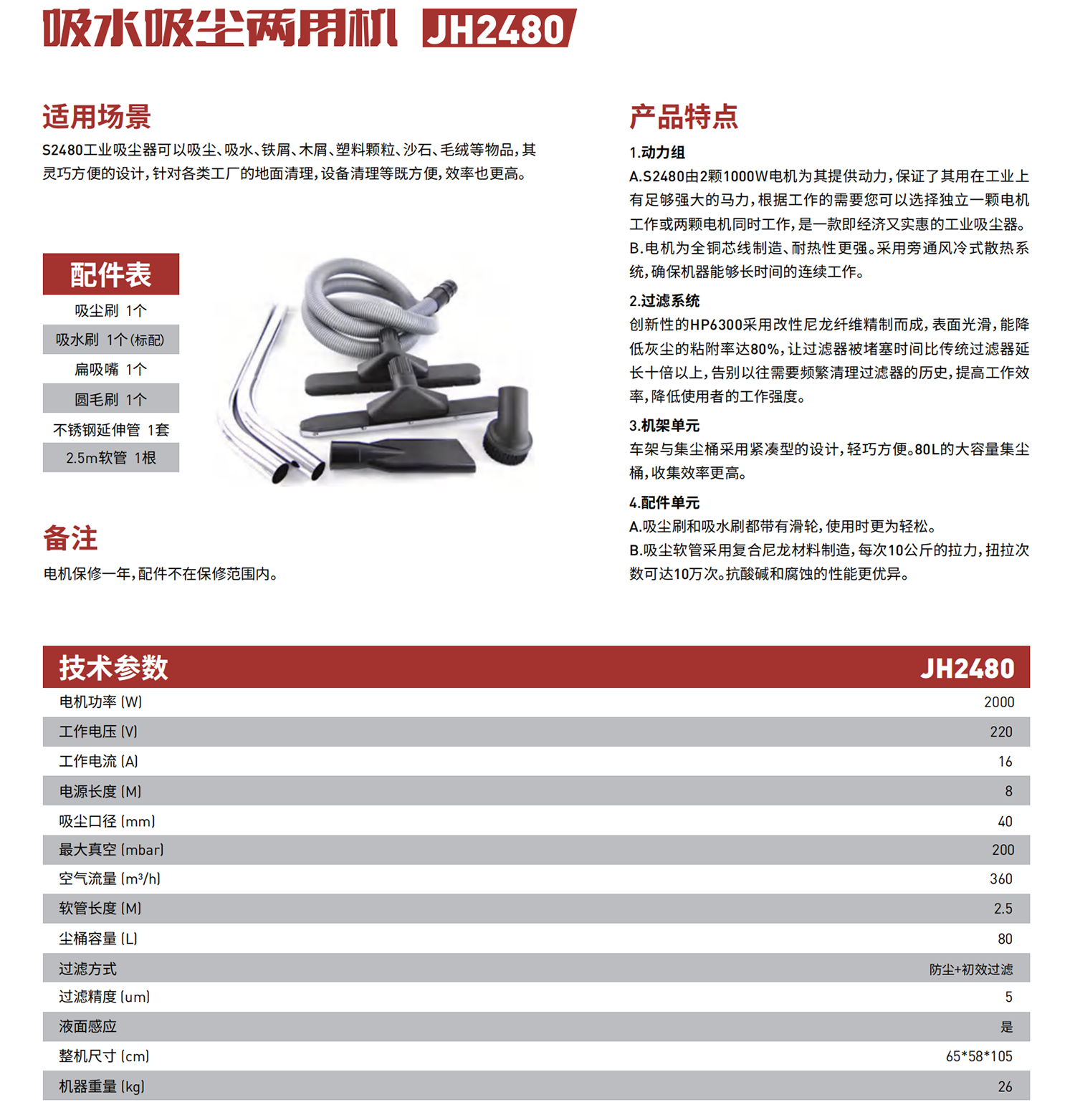 S2480工业吸尘器可以吸尘、吸水、铁屑、木屑、塑料颗粒、沙石、毛绒等物品,其灵巧方便的设计,针对各类工厂的地面清理,设备清理等既方便,效率也更高。