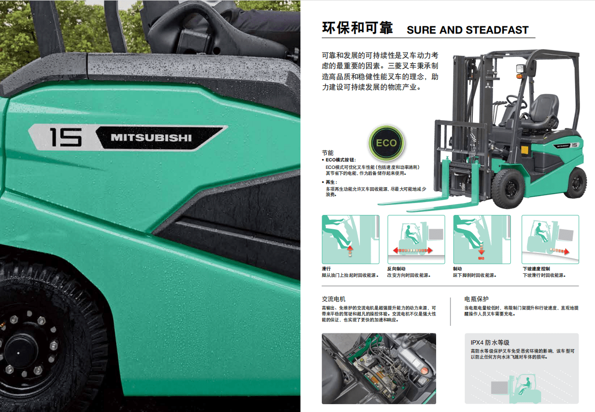 可靠和发展的可持续性是叉车动力考虑的最重要的因素。三菱叉车秉承制造高品质和稳健性能叉车的理念,助力建设可持续发展的物流产业。节能●ECO模式按钮∶ECO模式可优化叉车性能(包括速度和功率消耗)其节省下的电能,作为后备储存起来使用。●再生∶多项再生...